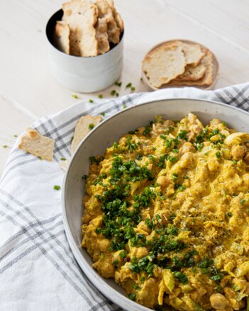 ... mit Lauchzwiebeln, Stangensellerie, Kichererbsen und Eierspeisgewürz.