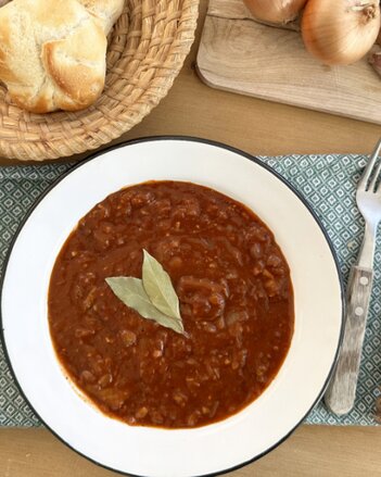 Weiter geht’s mit dem Gemüse. Die Zwiebel und der Knoblauch werden fein gehackt und in der veganen Butter goldbraun angebraten. Dann kommen das Gulaschgewürz und das Tomatenmark hinzu und die Speisestärke untergerührt.