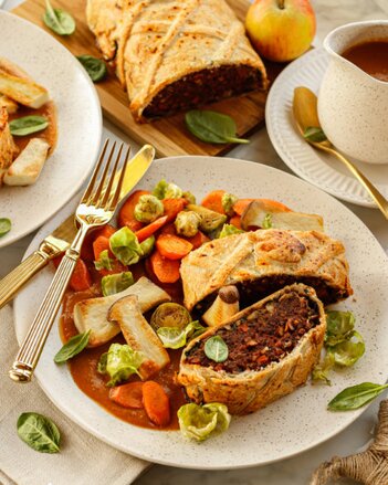 Lorbeer, Nelken und Zimtstange aus dem Topf nehmen und zu einer feinen Sauce pürieren. Mit Preiselbeersirup und Hafermilch verfeinern. Je nach Konsistenz noch etwas Gemüsebrühe zugeben. Mit Salz und Pfeffer abschmecken.