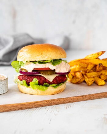 Burgerbuns mit allen Zutaten sowie dem Pattie belegen und mit der Sauce bestreichen, oberen Deckel darüber geben und servieren.