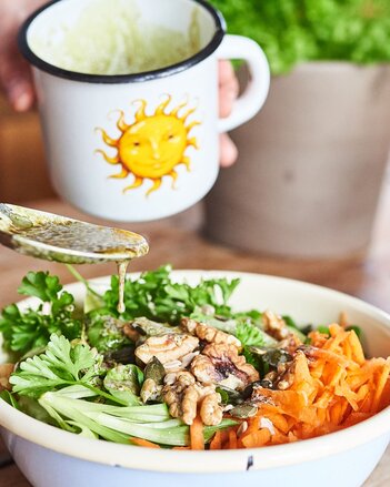 Frisches Grün in Form von Blattsalaten, der Vitamin-C-Bombe Petersilie und einem leichten und nussigen Dressing aus Kernöl