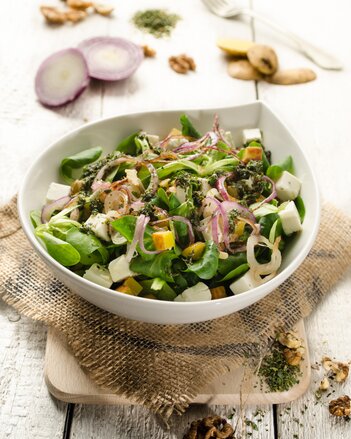 Vogerlsalat gründlich waschen, putzen und trockenschleudern. Zwiebel schälen und in Ringe schneiden. Den Schafkäse in größere Stücke schneiden.