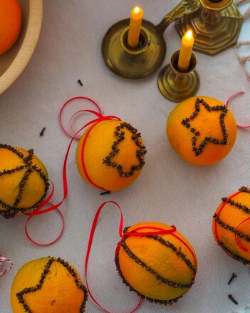 Die Orangen sehen besonders hübsch aus, wenn um sie ein rotes, dünnes Band gebunden wird. Mit dem Band auf einen Ast aufhängen, in eine Schüssel als weihnachtliche Dekoration legen oder verschenken.