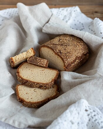 Dann etwas Goldleinmehl und Sesam vermischen und auf einer Arbeitsfläche verteilen. Den Brotteig auf das Mehl-Sesam Gemisch stürzen, darin wälzen und zu einen Brotlaib formen.