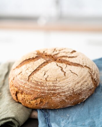 Dann das Brot auf ein vorgeheiztes Blech stürzen und ev. einschneiden. Bei 250° C ins gut vorgeheizte Rohr schieben, den Backraum mittels Sprühflasche „schwaden“ und das Brot 8-10 Minuten anbacken. Dann die Temperatur reduzieren und bei 200°C insgesamt ca. 50 Minuten backen. Das Brot ist fertig, wenn es eine Kerntemperatur von 95-97 ° C erreicht hat. Brot aus dem Ofen nehmen, leicht mit Wasser besprühen und auf einem Gitterrost auskühlen lassen.