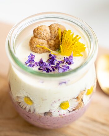 Dieses Dessert aus cremigen Topfenvarianten besticht mit den bunten Wildkräuterblüten und den knusprigen Keksen.