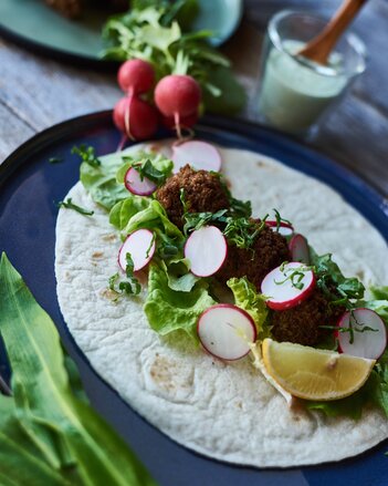 Wraps erwärmen und mit Falafeln, Salat und Joghurtdip füllen.