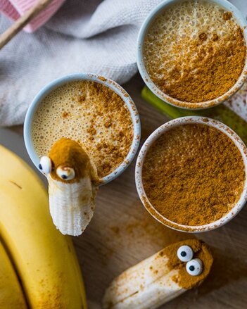 Banane in 4 cm lange Stücke schneiden, an einem Ende in das Kurkuma-Vanille-Pulver tauchen und mit den Zuckeraugen verziert an den Glasrand stecken.