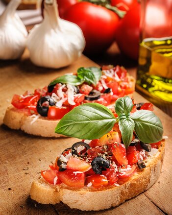 In der Zwischenzeit das Brot toasten oder im Backrohr kross rösten. Danach die Bruschettamasse auf die warmen Brote verteilen, und nochmals kurz im Rohr überbacken. Warm genießen.