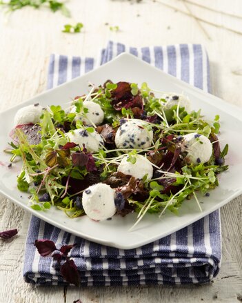 Die gekochten roten Rüben mit Salz und ein wenig Balsamico-Essig marinieren. Zusammen mit dem Ziegenfrischkäse, frischen Gartenkräutern, Salat und Lavendelblüten anrichten.