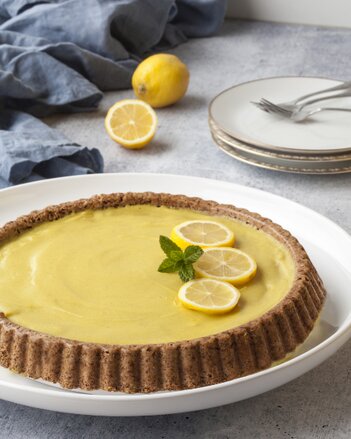 Tarte mit Minze und unbehandelten Zitronenscheiben dekorieren.