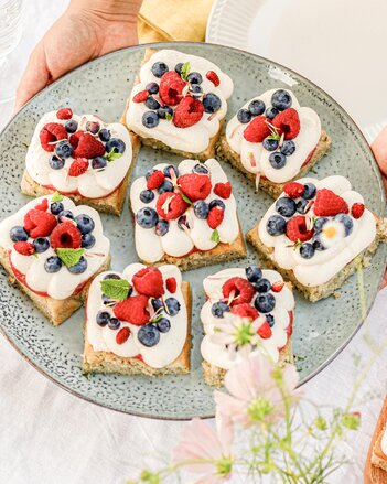 Die Creme hübsch auf die Kuchenstücke spritzen und mit frischen Beeren belegen. Nach Belieben noch mit ein paar Minzeblätter und Blüten, wie Ringelblumen oder Kamille dekorieren.