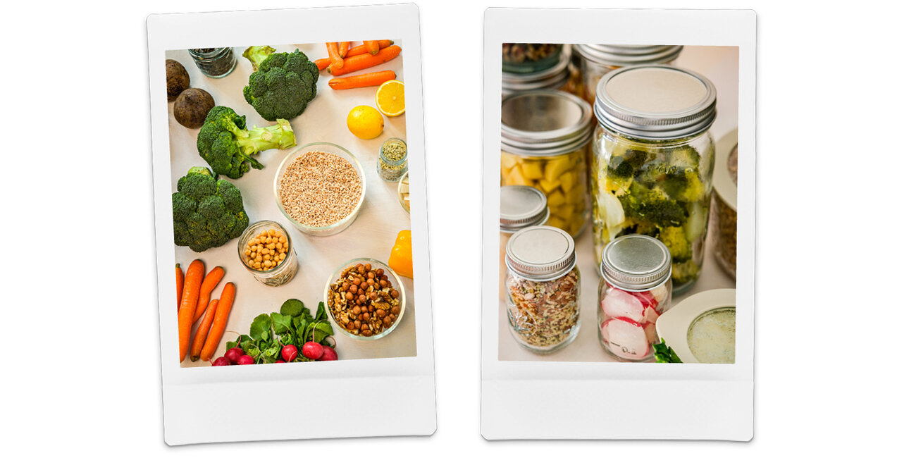 - Wähle als Basis Zutaten, die sich gut lagern lassen, wie z.B. gekochten Reis oder Quinoa, vorgegartes Gemüse, Saucen und Proteine (gebratenes Fleisch oder Tofu-Würfel)