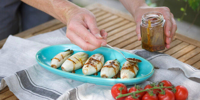 Zubereitung: Die Chicoree Herzen kurz bei großer Hitze grillen, damit an der Außenseite ordentliche Röstaromen entstehen, im Inneren sollte der Salat aber immer noch knackig bleiben. Für die Marinade