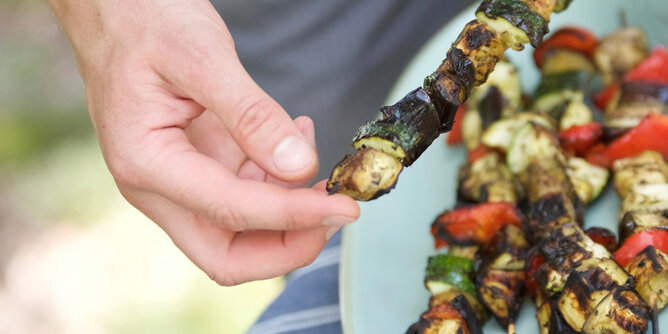 Mit dem Grillgemüse ist es immer so eine Sache, nicht selten landen Pilze und Co. auf den heißen Kohlen. Fädelt man die Köstlichkeiten aber auf Grillspieße, rutscht garantiert nichts durch den Rost. Und das Ratatouille vom Spieß zu knabbern, ist für alle die gern mit den Händen essen, bestimmt ein kleines Highlight.