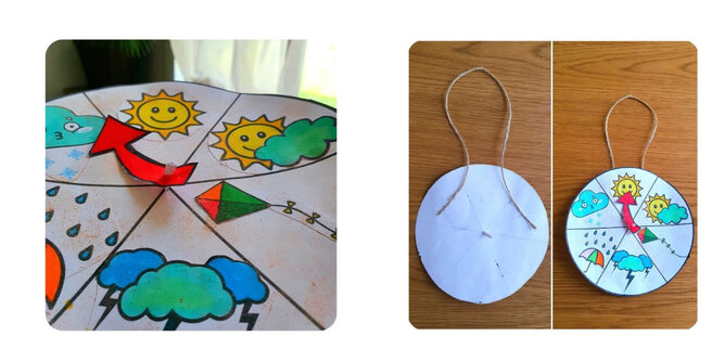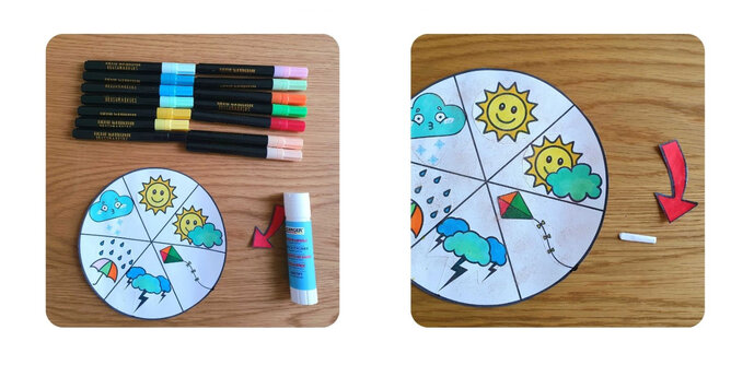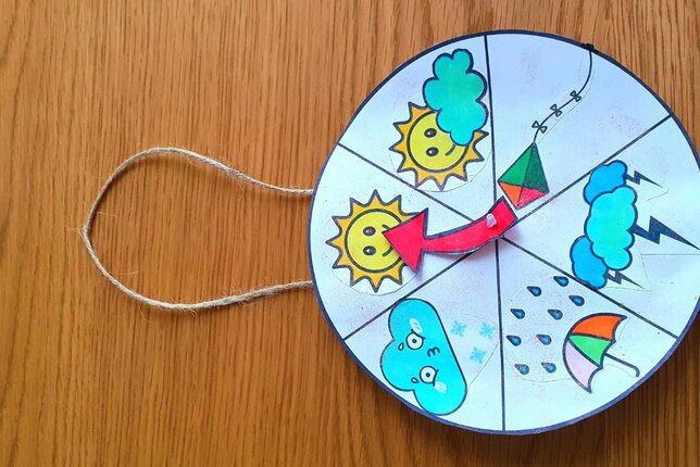 Als Erstes nimmst du die ausgedruckte Vorlage und malst alle Motive, wie die Sonne, die Wolken, den Pfeil usw. aus. Wenn alle Elemente bunt sind, schneide sie gemeinsam mit dem Kreis aus. Da das manchmal etwas schwierig sein kann, lass dir von einem Erwachsenen helfen. Als nächstes ist es an der Zeit, alle ausgeschnittenen Motive an den Kreis mit Kleber anzubringen. Hier ist wichtig, dass jeder Kreissektor, es gibt insgesamt 6 davon, ein Element beinhaltet. Um das Wetter anzeigen zu können musst du nun den Pfeil zu der Uhr hinzufügen. Nimm das kleine Stück Papier, es sollte nicht größer als 3 Zentimeter groß sein, und rolle es zusammen. Mache ein Loch in die Mitte des Kreises sowie am Ende des Pfeils mit einem Bleistift und stecke dann das fest zusammengerollte Papierstück hindurch, so wie auf dem Foto. Befestige es nun mit etwas Flüssigkleber. Falls du eine Rundkopfklammer zu Hause hast, kannst du auch diese für das Anbringen des Pfeiles verwenden. Fast geschafft, jetzt fehlt nur mehr die Schnur, damit du die Wetteruhr aufhängen kannst. Fixiere die beiden Enden der Schnur an der Rückseite und schon bist du fertig!