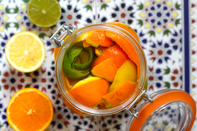 So einfach geht’s: Zitrusschalen zerkleinern und in ein verschließbares Glas (z.B. ausgewaschenes Marmeladeglas) geben. Mit Essig (Tafel- oder Weißweinessig) bis obenhin auffüllen, verschließen und 2 Wochen ziehen lassen. Da die Schalen Flüssigkeiten aufsaugen, muss gelegentlich etwas Essig nachgefüllt werden. Danach wird das Ganze abgeseiht und in eine (Sprüh-)Flasche gefüllt. Fertig!