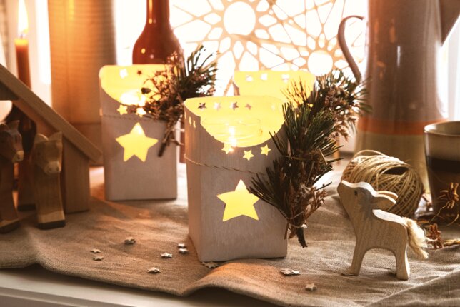 Mit gleich mehreren Teekarton Windlichtern erstrahlt die Fensterbank oder der überdachte Hauseingang in weihnachtlichem Glanz.