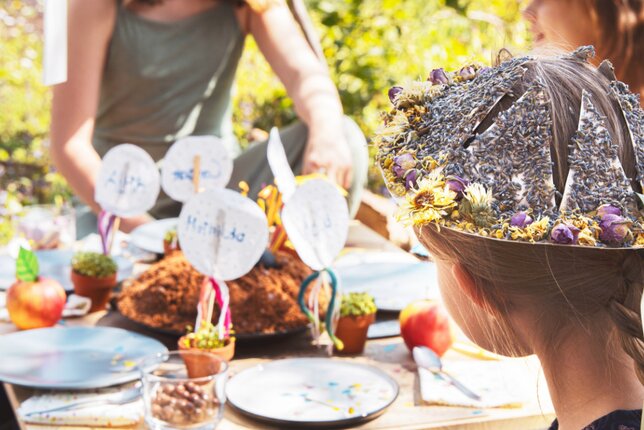 Auf dem Foto sieht man ein Mädchen, das vor ihrem Geburtstagstisch sitzt. Sie trägt eine Kräuter Geburtstagskrone aus einem Pappteller. | © SONNENTOR