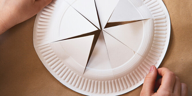 2. Mit Hilfe von Lineal und Bleistift 4 Tortenstücke auf dem Pappteller-Halbkreis zeichnen.