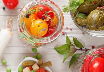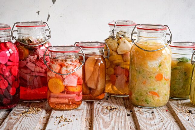 Zum Haltbarmachen eignet sich besonders hochwertiger Wein- und Obstessig, wie etwa Apfelessig. Essig verhindert die Bakterienbildung und sollte mindestens 5% Säure haben. Sie macht das eingelegte Gemüse haltbar – daher sollte die im jeweiligen Rezept angegebene Essigmenge nicht reduziert werden. Das Gemüse muss mit Essig bedeckt sein. Nach etwa 2 Wochen kannst du das eingelegte Gemüse verkosten. Nach einem Monat kühler Lagerung hat sich der Geschmack voll entfaltet. Geöffnete Gläser sind im Kühlschrank etwa 2 Wochen haltbar.