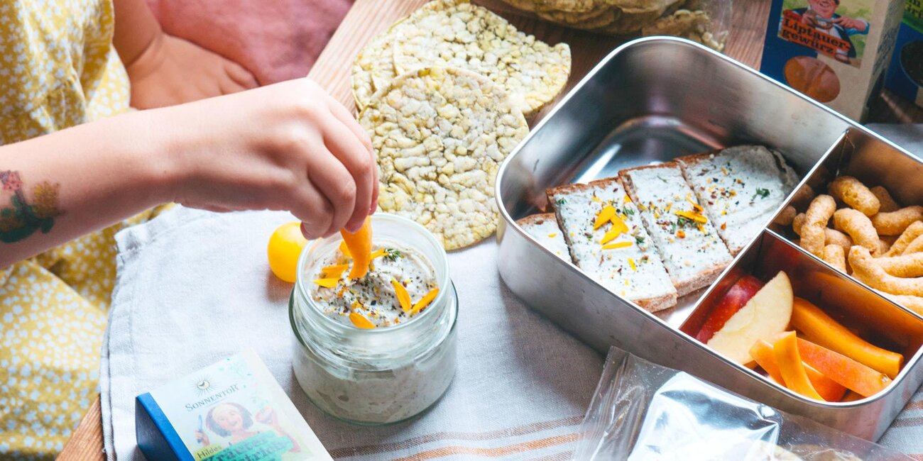 An erster Stelle steht frisches Obst und Gemüse. Gewaschen und in mundgerechte Stücke geschnitten und in einer praktischen Edelstahl-Jausen Box verpackt, ist es immer griffbereit und liefert hungrigen und müden Kindern neue Energie. Wer möchte, kann auch einen Dip für Karotten, Gurken oder Selleriesticks in einem Glas vorbereiten und einpacken, zum Beispiel etwas Topfen oder Ricotta vermischt mit Hildes Kräuteraufstrichgewürz. Der Aufstrich ist im Handumdrehen aufs Brot gestrichen.