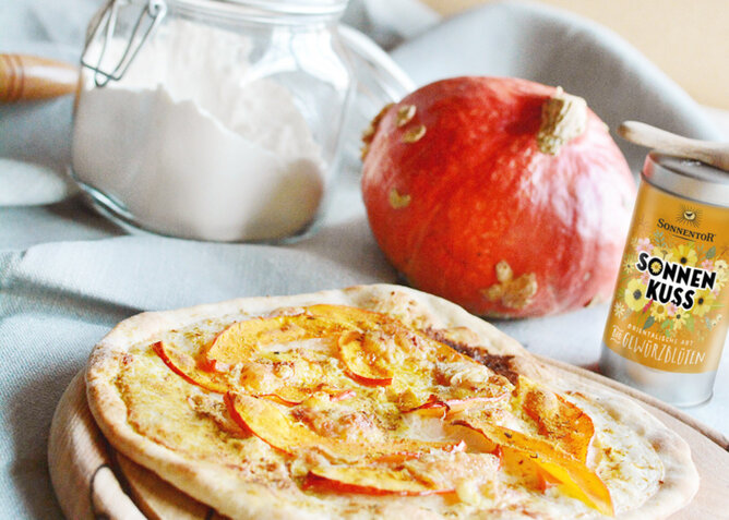 Sonnenkuss – die wärmende Currymischung ist perfekt für eine herbstliche Flammkuchenvariante mit Kürbis und Ziegenkäse. Die Farben harmonieren ebenso gut wie der Geschmack. Die leicht süßliche Note des Kürbisses wird unterstützt durch die Aromen des Orients. Der Ziegenkäse bringt noch eine extra Portion Geschmack und den salzigen Gegenpol.