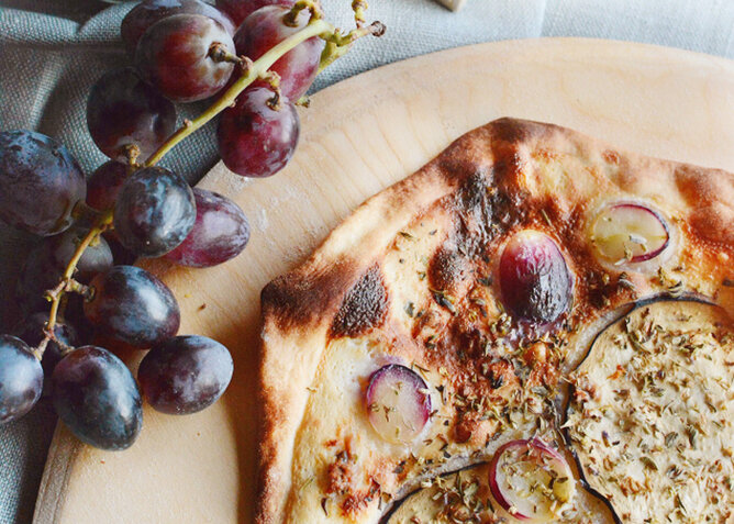 Traditionell besteht der Flammkuchen, neben dem bereits erwähnten Belag, aus einem einfachen Teig ohne Hefe – ist also nicht zu verwechseln mit seiner großen italienischer Schwester, der Pizza. Mehl, Wasser, etwas Öl und Salz mehr braucht es nicht. Wichtig ist nur, dass der Boden wirklich hauchdünn ausgerollt wird, denn nur so bekommt man die tarte flambée, wie sie in Frankreich heißt, richtig knusprig. Mit dem Teig halten wir es traditionell, aber beim Belag kann man sich ruhig ein bisschen austoben. Ein großes Durcheinander sollte man aber trotzdem vermeiden (außer man ist bekennender Fan der Pizza con tutti) - so können die einzelnen Aromen viel besser zur Geltung kommen und stehlen sich nicht gegenseitig die Schau! Ein netter Abend in kleiner Runde steht an und ihr habt keine Ahnung was ihr auftischen sollt. Bereitet einfach Teig und die Zutaten zum Belegen der Flammkuchen vor und jeder darf mal eine eigene Kreation in den Ofen schieben.