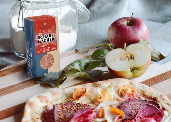 Darf‘s ein bisschen scharf sein?Dem erdigen Geschmack der roten und gelben Rüben wird mit den Scharfmachergewürzblüten ordentlich eingeheizt. Und die Farben dieses Flammkuchens lassen alle Herzen höher schlagen!