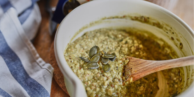 Haferbrei muss nicht immer süß sein, die Schotten beispielsweise essen ihren Porridge traditionell nur mit einer Prise Salz. Man kann den pikanten Frühstücksbrei aber auch interessanter gestalten. In unserem Fall sorgen Quendel und Kernöl für Farbe und Geschmack und Kürbiskerne für den nötigen Crunch. In etwas Gemüsebrühe gekocht, schmeckt dieser herzhafte Haferbrei sehr lecker.