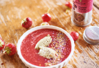 Und weil ein Süppchen natürlich auch als kühles Dessert serviert werden kann, gibts im Anschluss an unsere Kalte-Suppen-Parade eine erfrischende Schale mit einer Suppe aus Erdbeeren und Wassermelone mit einem flaumig-cremigen Nockerl aus Basilikum-Mousse, na wie hört sich das an? Noch nicht überzeugt, dann gebt noch eine Prise der Flower-Power Gewürzblüten dazu und keiner kann mehr widerstehen!