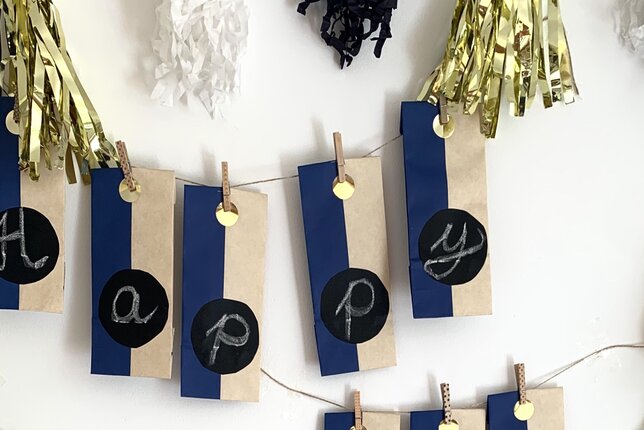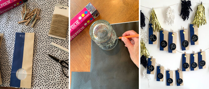 Leere Tee-Packungen werden mit wenigen Handgriffen ein Blickfang für Silvester. Ganz einfach wird die Girlande mit Tafelfolie gestaltet um Botschaften aufhängen zu können.