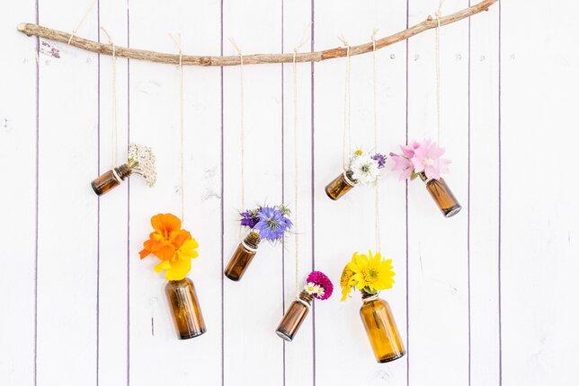 Auf dem Foto sieht man kleine ätherische Ölflaschen mit Blumen darin. Die Fläschchen sind mit einer Schnur an einem Stock befestigt. | © SONNENTOR
