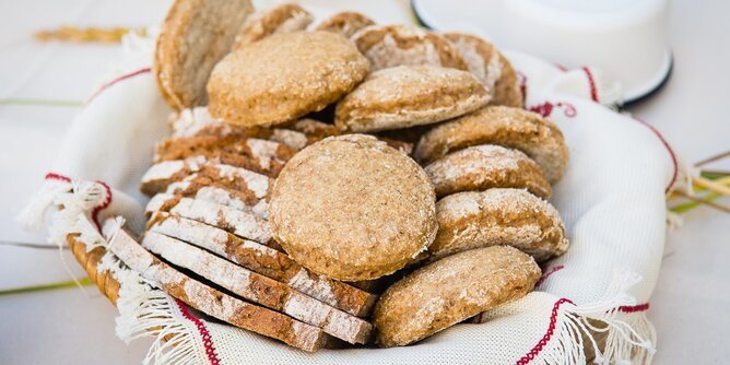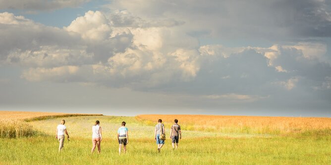 Nachdem wir das Angeber-Dinkelfeld besucht haben, mit dem der konventionell gebaute Dinkel auf dem Nachbarfeld eindeutig nicht in Konkurrenz treten kann, machen wir uns auf den Weg zu einem kleinen Sorgenkind, dem Bockshornklee. Der Waldviertler Sommer war bis jetzt richtig trocken, windig und heiß - der Boden ist rissig und die Pflanzen sind noch sehr klein und zwischen der vielen Konkurrenz (eine liebevolle Umschreibung für alles Unkraut, dass auf dem Bockshornkleefeld aufgegangen ist) haben sie sich bis jetzt noch nicht richtig durchsetzen können. Aber von so etwas lässt sich die Familie Brenner nicht ins Bockshorn jagen, ganz im Gegenteil, gemeinsam mit der Anbauberaterin Elfi tüfteln und überlegen sie, wie sie dieser Pflanze in dieser oder der nächsten Saison besser auf den Weg helfen können.Zum Abschluss des ereignisreichen Tages, wird uns noch prämiertes Brot, Einkornsalat und ein wunderbar flaumiger Gugelhupf aus Urgetreide aufgetischt.