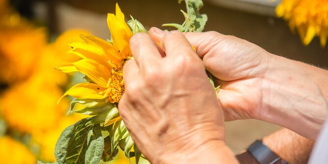 Helga Bauer, eine Sonnentor Bäuerin der ersten Stunde, deren Liebe zur Natur und den Kräutern sie zum Anbau für den damals noch in den Kinderschuhen steckenden Waldviertler Betrieb geführt hat. Nun wird der Hof bereits von ihrem Sohn und der Schwiegertochter weitergeführt. Ganz nach Konfuzius im Sinne von: „Lass es mich selber tun, und ich werde es verstehen!“ haben wir gemeinsam mit den Bauers die Blütenblätter von den Sonnenblumen gezupft und viel über die Geschichte des Betriebes, den Kräuteranbau und die Weiterverarbeitung der Blattkräuter erfahren.
