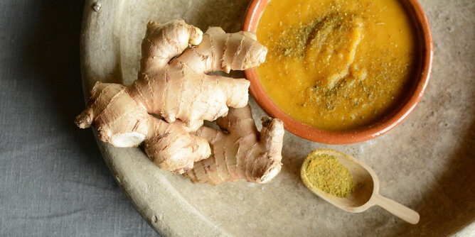 Wenn sich eine Erkältung ankündigt, ist eine heiße Suppe mit kräftigen Aromen genau das Richtige. Denn erstens ist nichts anstrengender als mit voller Nase etwas zu kauen und zweitens wirkt Ingwer schleimlösend. Die notwendigen Vitamine liefern Kürbis, Karotte und der Saft einer Orange. Man kann die Suppe mit einem Schuss Sahne oder für eine vegane Variante mit Kokosmilch verfeinern.