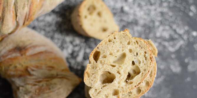 Alle Zutaten zu einem geschmeidigen, etwas klebrigen Teig zusammenkneten und abgedeckt an einem warmen Ort 1 h gehen lassen. Backrohr auf 275 ° vorheizen. Den Teig auf eine gut bemehlte Arbeitsfläche stürzen und in zwei Stücke teilen. Aus den beiden Stücken mit gut bemehlten Händen unvollkommene, verdrehte Stränge formen und auf ein Blech legen. 10 min bei 275° backen, dann auf 200 ° zurückschalten und weitere 14 min backen. Auf einem Rost auskühlen lassen.