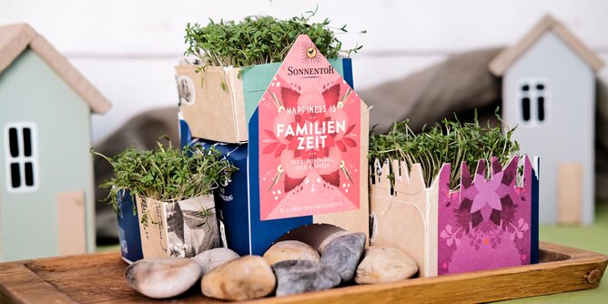 - Etwas Zellstoff (Papiertaschentuch) in die Eier legen, anfeuchten und die SONNENTOR Bio-Kresse aussäen. In 3 bis 7 Tagen kann dann fleißig geerntet werden!