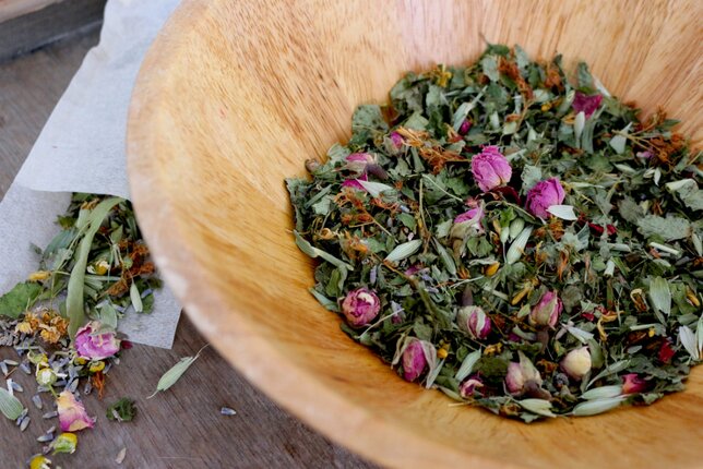 Mische die Kräuter zusammen, übergieße sie mit 1l heißem Wasser und lass den Tee 10 Minuten ziehen. Seihe ihn in eine Thermoskanne ab und trinke ihn über den Tag verteilt.