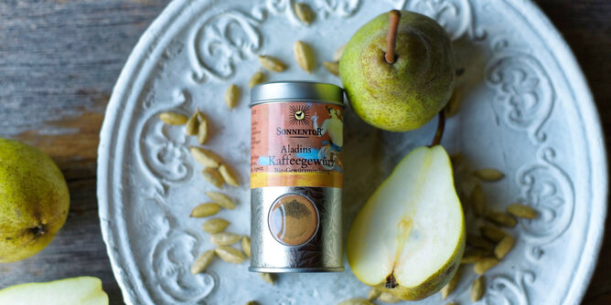 Zubereitung: Die Birnen schälen, vom Kerngehäuse befreien und in grobe Stücke schneiden. Die Äpfel ebenso vorbereiten. Das Obst mit etwas Wasser und den Datteln köcheln lassen. Mit dem Mixstab pürieren und mit Zitronensaft und Aladins Kaffeegewürz abschmecken. Heiß in sterile Gläser abfüllen und verschließen. Im Kühlschrank aufbewahren.