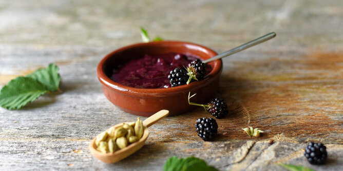 Zubereitung: Brombeeren waschen und gut abtropfen lassen. Beeren mit Kardamom, Zitronensaft und Gelierzucker vermischen und etwas ziehen lassen. In einem Topf langsam erhitzen und gute 5 Minuten sprudelnd kochen (Gelierprobe) In sterile heiße Gläser füllen und gleich verschließen.