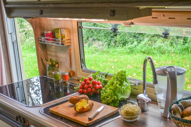 Auf dem Foto ist die Küche eines Campers zu sehen. In der Küche ist buntes Gemüse zu sehen. | © SONNENTOR