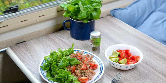 Für den Campingurlaub oder auch das Leben im Wohnmobil ist es sinnvoll immer einige Grundzutaten dabei zu haben. Zwar gibt es fast überall Einkaufsmöglichkeiten, aber wer doch mal zwei Wochen in einem Nationalpark verbringt, der wird es zu schätzen wissen, ein paar Lebensmittel auf Lager zu haben. Insbesondere Trockenware kann man gut lagern und hat so stets die Basis für ein schnelles Essen parat: Nudeln, Reis, Quinoa und (Süß-)Kartoffeln dürfen im Camper nie fehlen. Außerdem ein paar feuchte, lagerfähige Zutaten wie passierte Tomaten, Tomatenmark, Erdnussbutter, Sojasoße, Kidneybohnen und Mais im Glas und eine Flasche Ketchup für den Notfall. Mit diesen Zutaten hat man die Grundlage für Nudelsalat, Nudeln mit Soße, Quinoa-Bowl, Quinoa-Salat, Reis-Currys, Reis-Salat, Chilli Sin Carne, Bratkartoffeln, Kartoffeln mit Quark und mehr!
