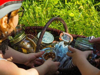 Bleiben Wiesenblumen oder Wildkräuter übrig, werden daraus flugs Blumenkränze für die Kinder gebunden. Dafür einfach ein paar reißfeste hohe Gräser pflücken, in drei Stränge teilen, in Pferdeschwanz-Technik Wildblumen in die Gräserstränge einflechten und die Enden zu einem Kranz verschlingen. Oder aber man hat noch ein paar Marmeladegläser mit Wasser gefüllt mitgebracht, um mit den kleinen, wilden Blumen die Picknickdecke natürlich zu schmücken.