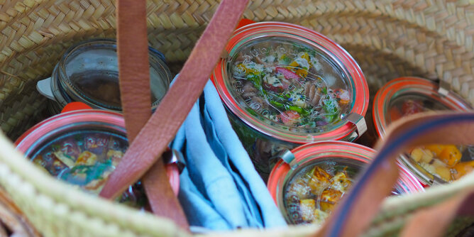 Es macht Sinn Marmelade- oder Konservengläser unterschiedlicher Größe nicht zu entsorgen, sondern aufzubewahren, um darin die Köstlichkeiten für unterwegs zu transportieren. Dressing- und Schüttelsalate am besten nicht bis zum Rand des Glases vollfüllen, damit der Inhalt noch ordentlich durchmischt werden kann. Sollen die Gläser unterwegs nicht zu Bruch gehen, rollt man sie einfach in Stoffservietten oder legt diese als Schutz dazwischen.