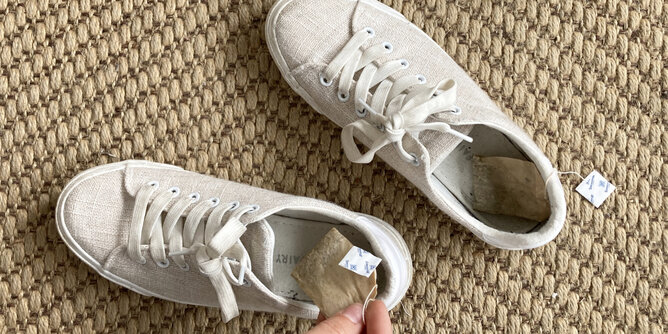 Um die Feuchtigkeit aus den Schuhen zu bekommen einfach den Teebeutel nach Gebrauch trocknen lassen und in die Schuhe stecken. Toller Nebeneffekt: Die Beutel hinterlassen einen angenehmen Geruch. Am besten eignen sich hier Teebeutel von besonders intenstiven Kräutern (z.B.: Pfefferminztee).