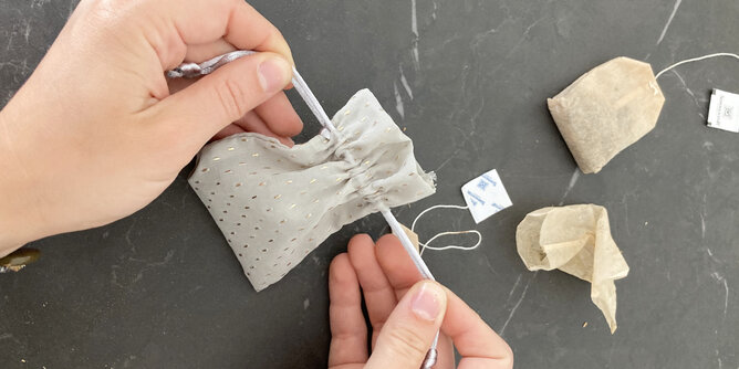 Auch als Geschenkidee geeignet: Den getrockneten Inhalt der Teebeutel nach Gebrauch in ein Stoffsäckchen füllen. So hast du ganz lange etwas von den angenehmem Duft und kannst es dort plazieren, wo du willst oder ganz einfach verschenken.