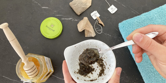 Den Inhalt des getrockneten Grünteebeutels mit 1 EL Sonnige Grüße Honig mischen und auf das Gesicht auftragen und einreiben. Das Peeling kurz einwirken lassen und abspülen. Das Peeling reinigt die Haut sanft und versorgt sie mit guten Nährstoffen.