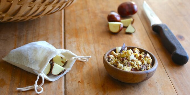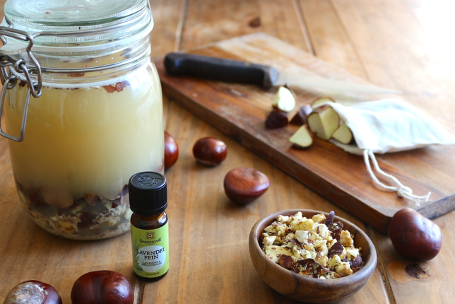 Und so wird’s gemacht: Nach dem Sammeln sollten die Kastanien zu allererst gut gewaschen werden. Danach geht’s ans Zerkleinern. Da das Fruchtfleisch gut geschützt unter der harten Schale liegt, müssen die Kastanien mit Hilfe eines Hammers oder Fleischklopfers zerstoßen werden. Um dabei herumfliegende Kastanien-Stücke zu vermeiden, gibt man sie am besten in ein Stoffsackerl und klopft dann drauf los. Je kleiner die Stücke werden, umso besser lösen sich die Seifenstoffe. Anschließend füllt man die Kastanienbrösel in ein Schraubglas und gießt sie mit lauwarmen Wasser auf. Schüttelt man das Glas, bildet sich sofort der typische seifenartige Schaum.