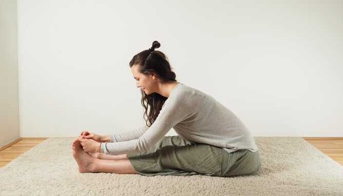 - Lass deine Arme entspannt auf deinen Oberschenkeln, Unterschenkeln rasten oder umklammere mit Daumen, Zeige- und Mittelfinger deine großen Zehen. Wie weit du nach vorne kommst, ist nicht relevant! Ja, wirklich! In jedem Fall sind deine Schultern entspannt und die Arme leicht angewinkelt.